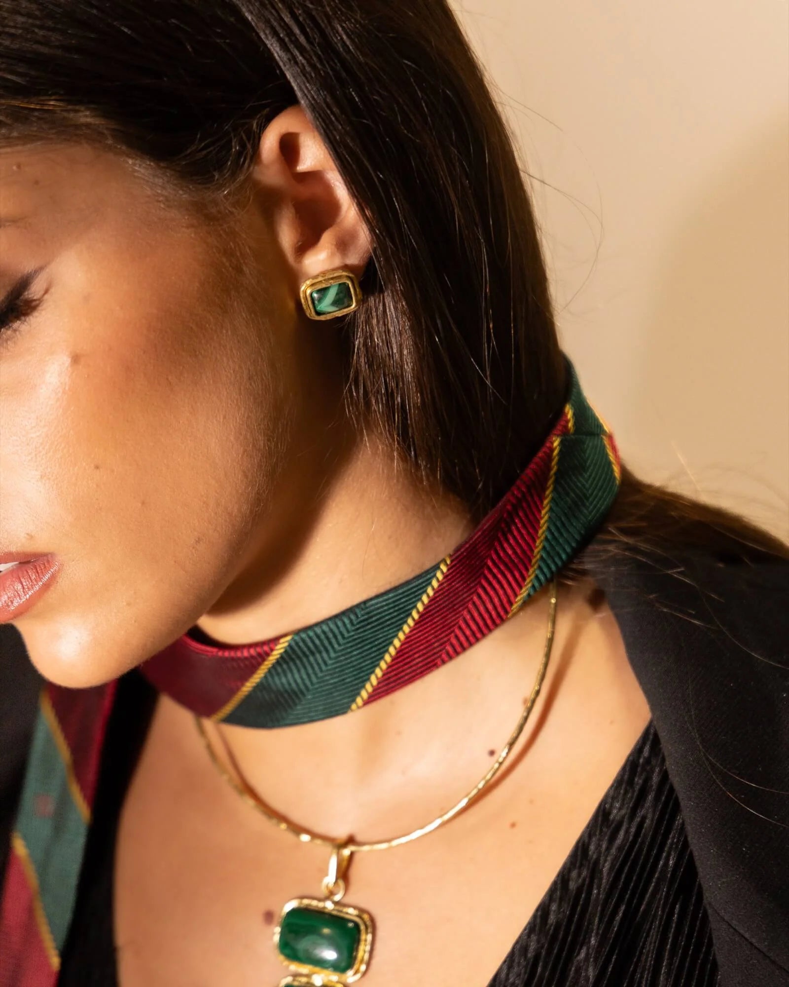 Cercei cu șurub, realizați manual, cu piatră naturală de malachit.