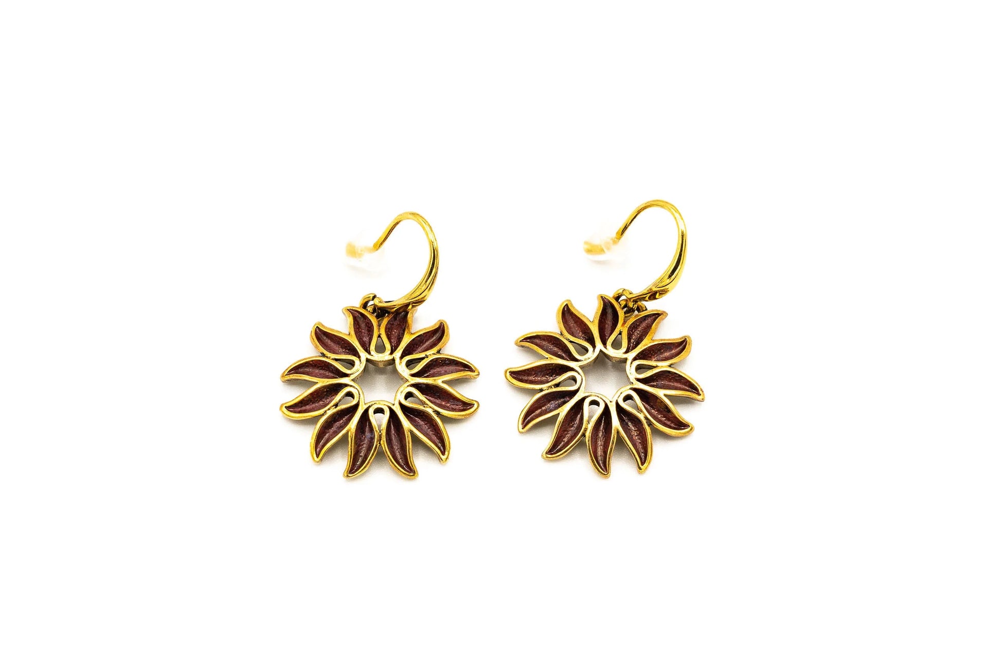 Cercei cu pandantiv de soare pictați manual, placați cu aur antic. Diametrul soarelui : 2 cm